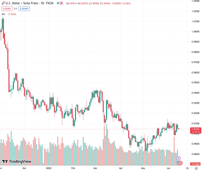 The US Dollar (USD) remains on the defensive just above its lowest level since May 17 touched on Tuesday and is seen as a key factor acting as a headwind for the USD/CHF pair. The latest US consumer inflation figures released on Tuesday reaffirmed bets that the Federal Reserve (Fed) will skip hiking interest rates at the end of a two-day policy meeting later this Wednesday and continues to undermine the Greenback.