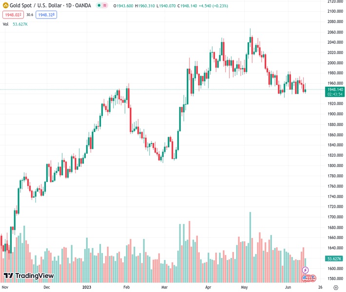 The XAUUSD is at 1,945.28 and the Federal Reserve has decided to maintain interest rates at 5.00-5.25%.