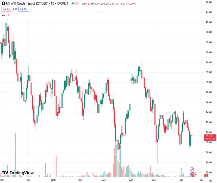 XTIUSD currently trading at 69.32 at the time of writing. Pair opened at 69.44 and is trading with a change of -0.17% % .