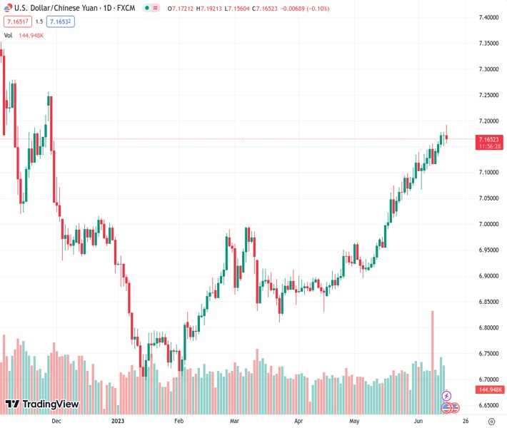 According to UOB, there is an increasing likelihood of the USDCNH surpassing 7.2000, as betting in favor of this rise is gaining momentum. The current value of USDCNH stands at 7.16409.
