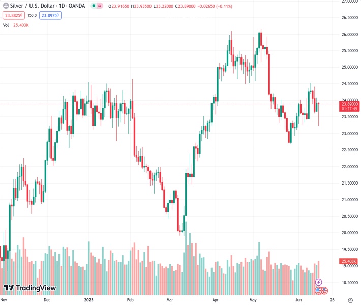 XAGUSD currently trading at 23.86 at the time of writing. Pair opened at 23.93 and is trading with a change of -0.29 % .