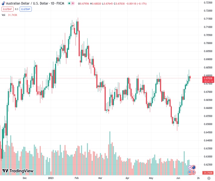 AUDUSD currently trading at 0.677 at the time of writing. Pair opened at 0.6796 and is trading with a change of -0.38 % .