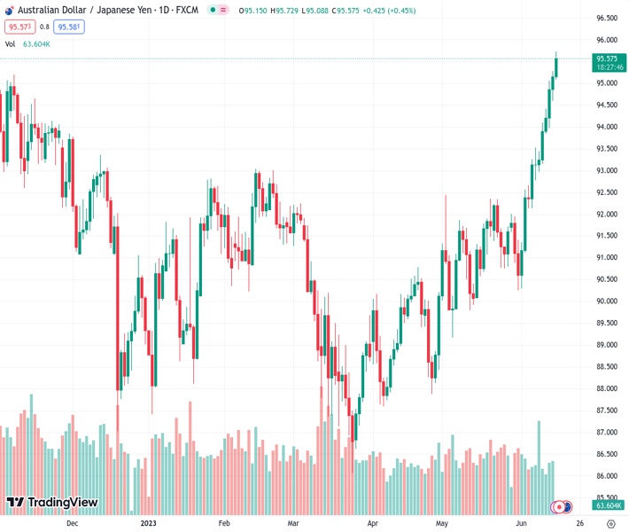 The AUDJPY currency pair has retreated from its peak levels, which were last observed in November 2022, due to the ambiguous employment report for May in Australia. The current trading price is 95.5990.