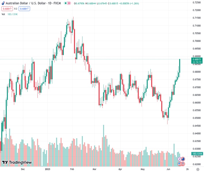 The AUDUSD has experienced six consecutive days of increases, with a rise to the 0.6870 zone from the current level of 0.68821.