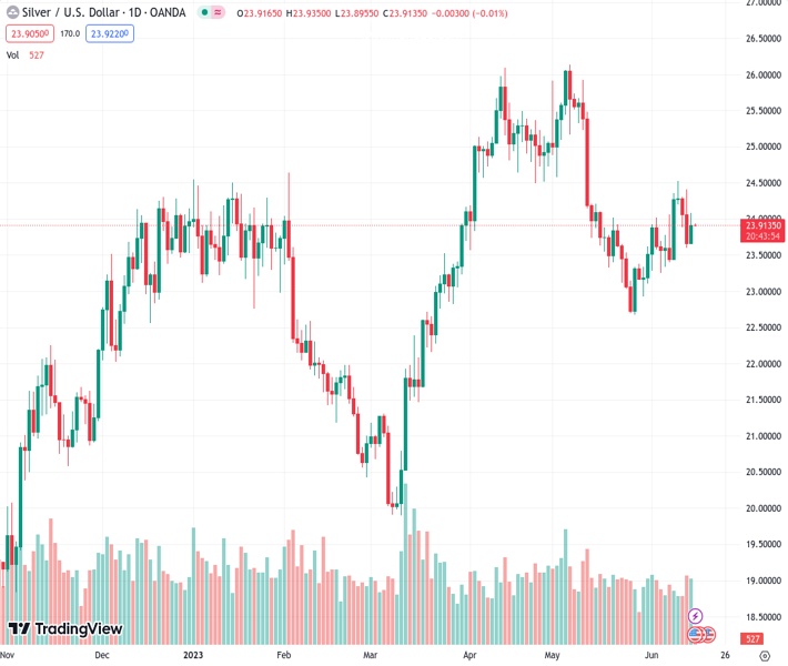 XAGUSD currently trading at 23.9 at the time of writing. Pair opened at 23.67 and is trading with a change of 0.97% % .