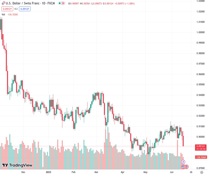 The Swiss Franc is gaining strength at a rate of 0.89122 USDCHF, but a potential correction is being watched for.