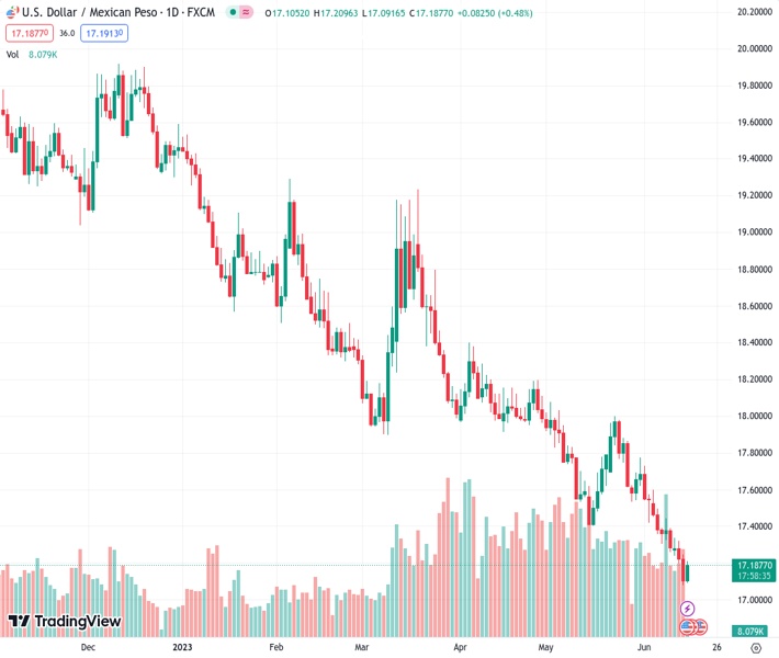 USDMXN currently trading at 17.2092 at the time of writing. Pair opened at 17.1068 and is trading with a change of 0.60% % .