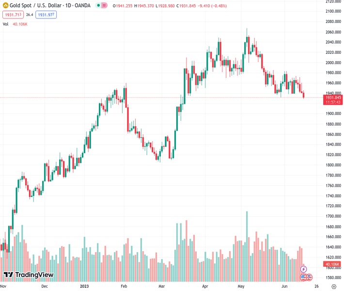 Gold price (XAU/USD) has witnessed selling pressure after a less-confident recovery to near $1,934.74 in the London session. The precious metal has retreated as a neutral interest rate decision by the Federal Reserve (Fed) is merely a skip. Fed chair Jerome Powell has confirmed that more interest rate hikes will be announced as a victory against stubborn inflation is still far.