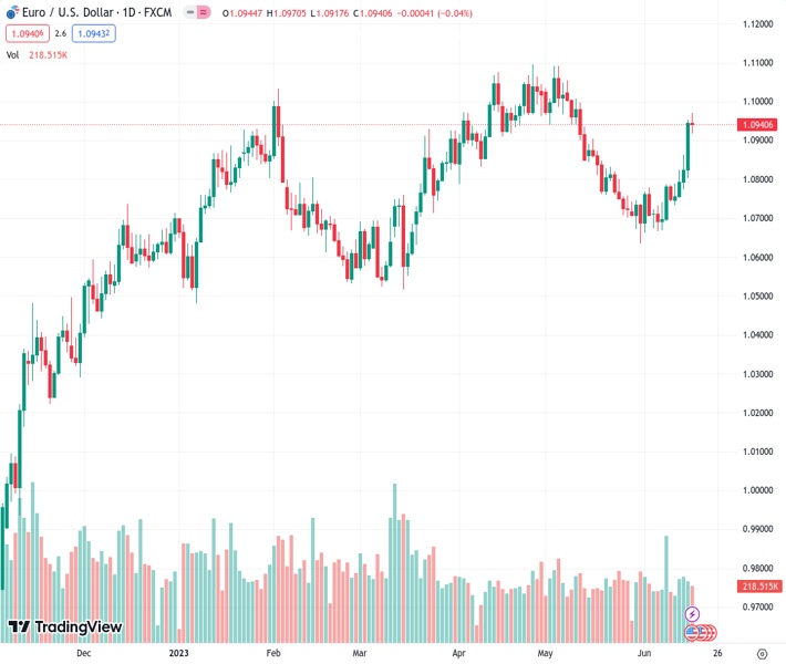 • The euro surged into the 1.0970 mark vs. the US Dollar on Friday, reaching its strongest level since May, following the European Central Bank’s decision to raise interest rates for the eighth consecutive time earlier in the week. There was also a signal that future rate hikes were on the table, leaving scope for higher highs in the pair: