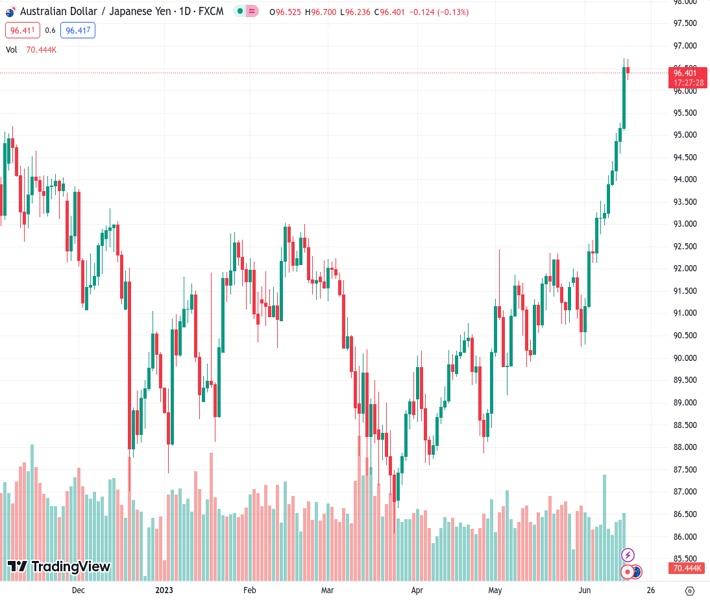 AUDJPY currently trading at 96.64 at the time of writing. Pair opened at 96.62 and is trading with a change of 0.02% % .