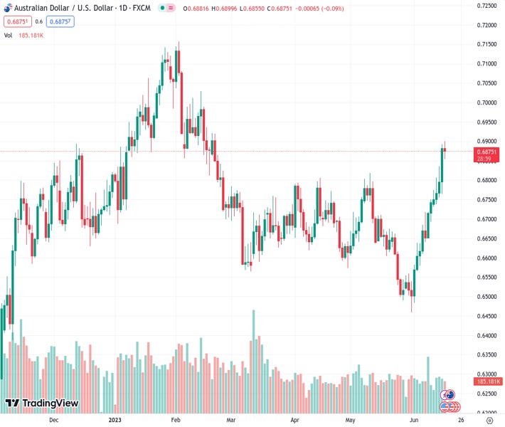 • The Australian dollar has been running on its last gas into the close on Friday with the price at its highest in four months, after surging 1.3% overnight. It is set for a 2.2% weekly gain, the best since mid-November 2022, and way off its 2023 low of $0.6459 two weeks ago. Technically the price is now reaching a daily order block: