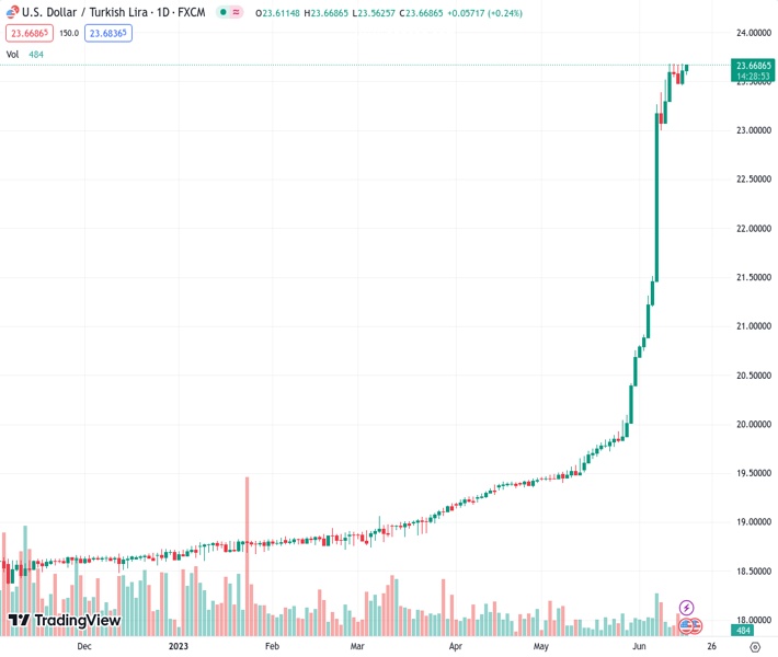 The currency pair USD to TRY is fluctuating within a volatile weekly range following a recent record high.