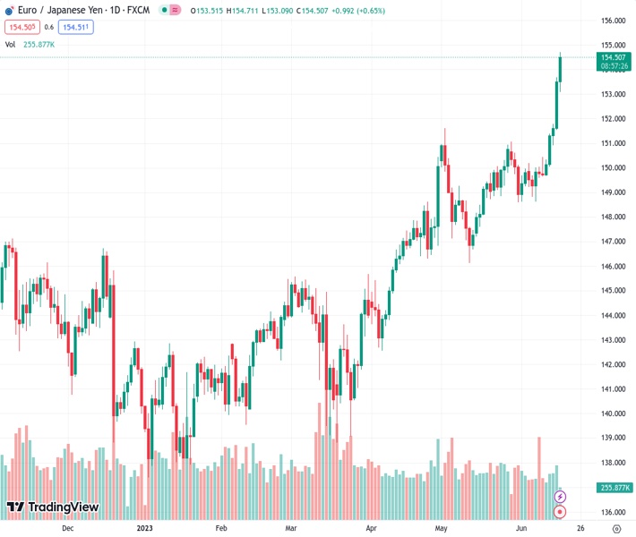 EURJPY currently trading at 154.36 at the time of writing. Pair opened at 153.58 and is trading with a change of 0.51 % .