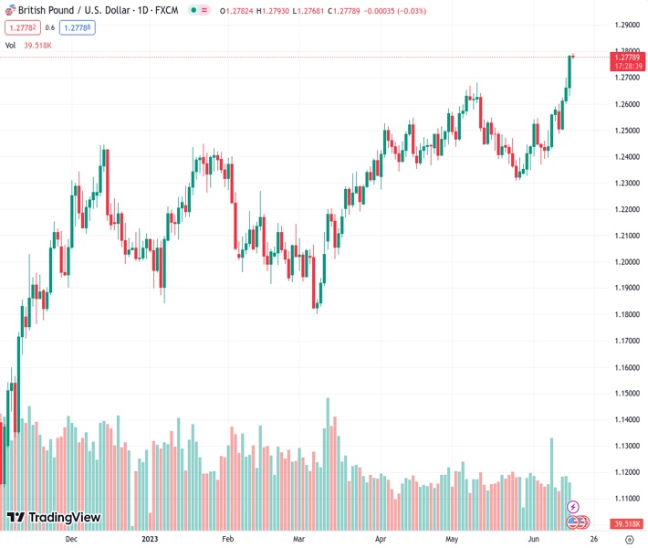 The GBPUSD pair, currently trading at 1.27785, is facing difficulty in determining its next move despite being at its highest levels since April 2022. The pair has broken its three-day uptrend.
