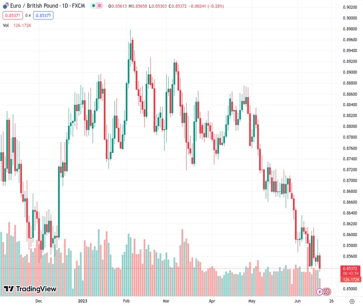 On Thursday, as expected, the ECB raised rates by 25 basis points. Despite the hawkish tone from President Lagarde, who mentioned that another hike in July was likely, the EUR/GBP only rose modestly approaching 0.8600 and then weakened again.