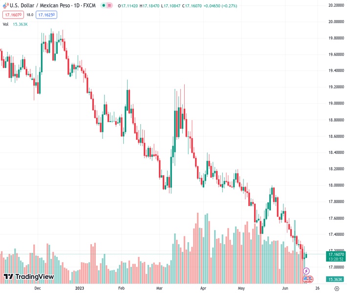 USDMXN currently trading at 17.1846 at the time of writing. Pair opened at 17.121 and is trading with a change of 0.37 % .