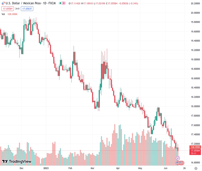 USDMXN currently trading at 17.0381 at the time of writing. Pair opened at 17.121 and is trading with a change of -0.48 % .