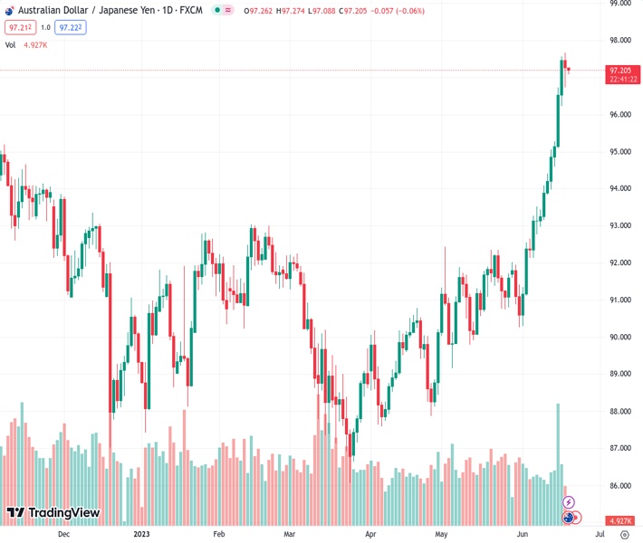 AUDJPY currently trading at 97.2 at the time of writing. Pair opened at 97.56 and is trading with a change of -0.37 % .