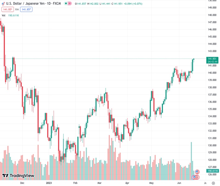 The exchange rate of USDJPY remains steady at around 141.80 after reaching its peak in November 2022.