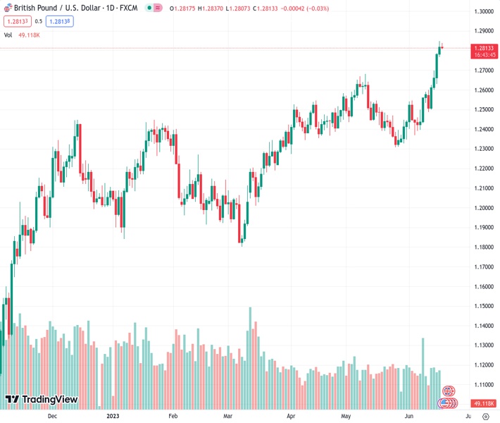 The GBP/USD pair at a rate of 1.28129 has dropped from its previous top levels since April 2022, putting a halt on its four-day upward trend. @nehcap predicts a decline in this currency pair’s value.