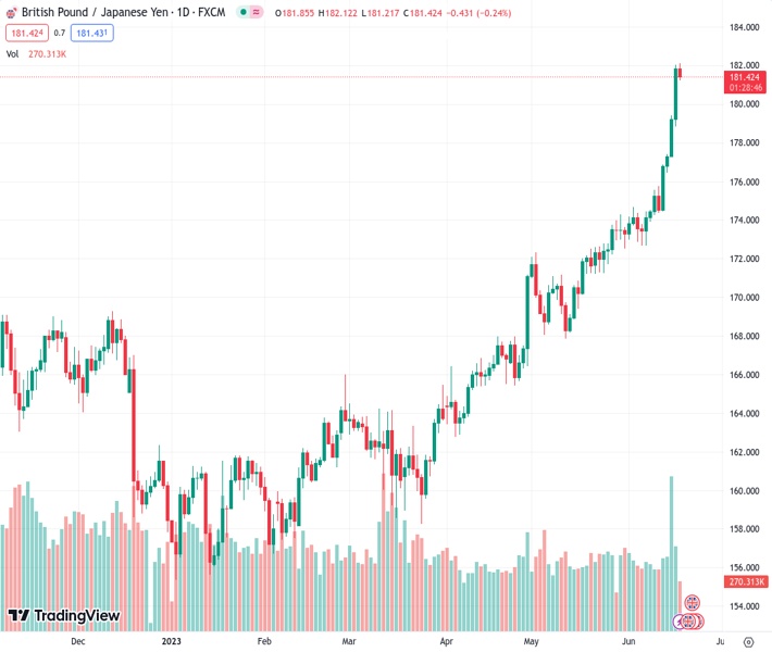 GBPJPY currently trading at 181.41 at the time of writing. Pair opened at 181.87 and is trading with a change of -0.25 % .