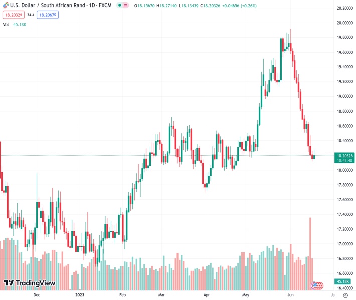 The ING predicts that the Rand will continue to be weak due to geopolitical factors, with the USD/ZAR trading at 18.2013.