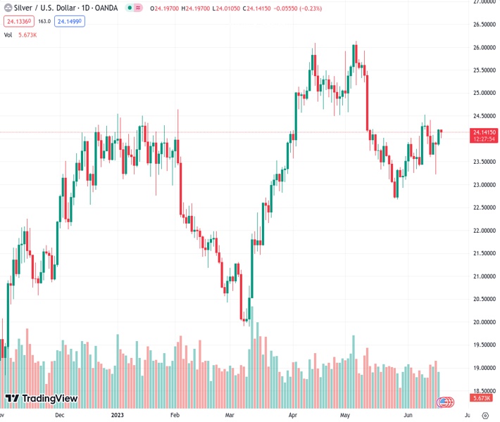 The value of silver, represented by #XAGUSD at 24.148, experienced a slight decrease, nearing $24.00 due to the USD Index remaining consistent.