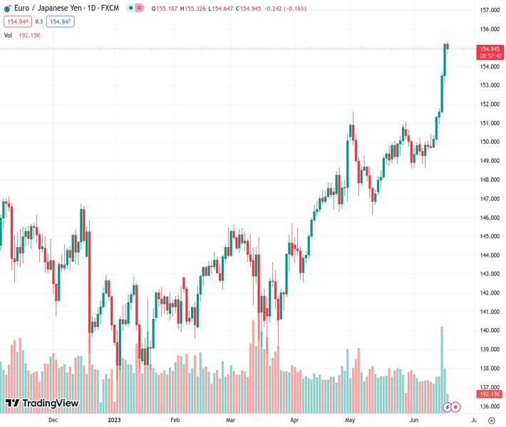 EURJPY currently trading at 155.01 at the time of writing. Pair opened at 155.21 and is trading with a change of -0.13 % .