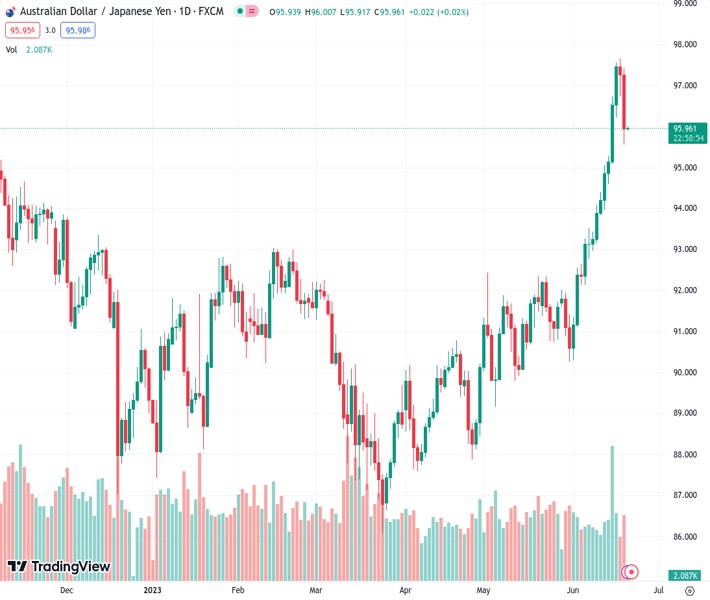 AUDJPY currently trading at 95.98 at the time of writing. Pair opened at 97.26 and is trading with a change of -1.32 % .