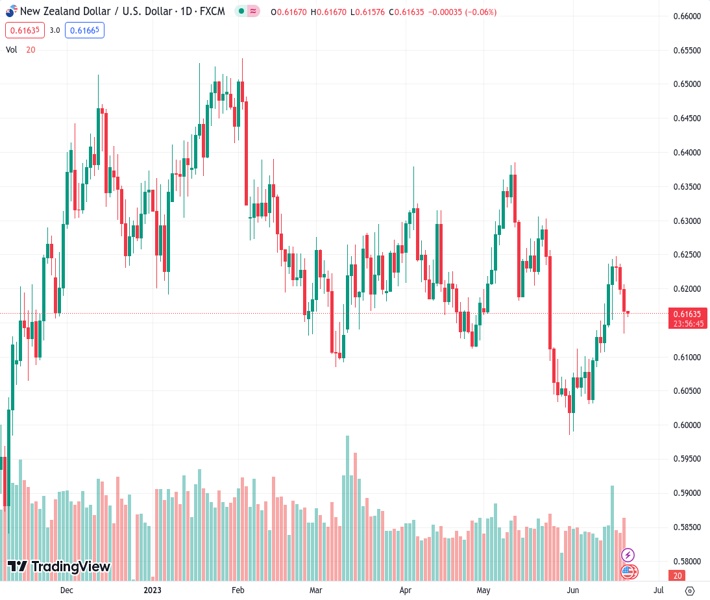 The currency pair of New Zealand Dollar and US Dollar, with a value of 0.61644, dipped under the 100-day Simple Moving Average (SMA) and hit a bottom of 0.6133. However, it later bounced back and steadied at 0.6160.