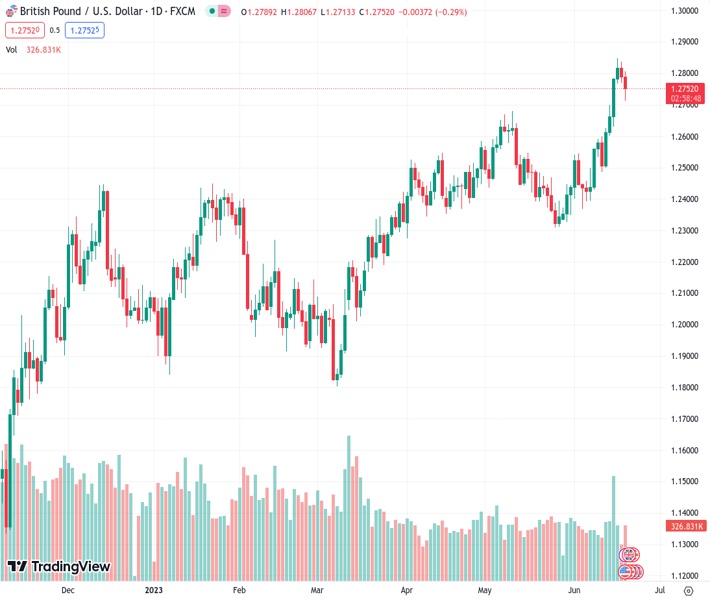 The movement of GBPUSD at 1.27523 has been influenced by the strong US Dollar, which is due to the expected tightening by the US Federal Reserve and an overbought equity market in the US.