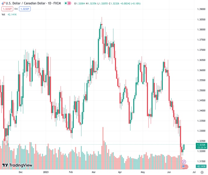USDCAD currently trading at 1.3232 at the time of writing. Pair opened at 1.321 and is trading with a change of 0.17% % .