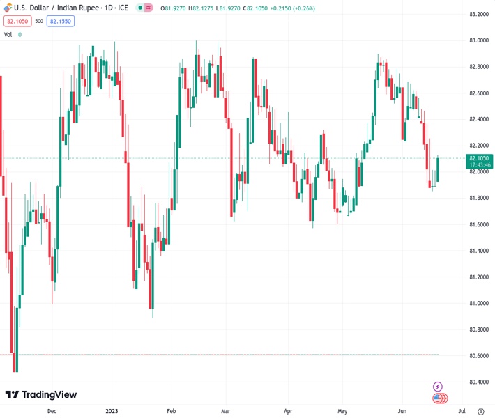 USDINR currently trading at 82.0919 at the time of writing. Pair opened at 81.983 and is trading with a change of 0.13% % .