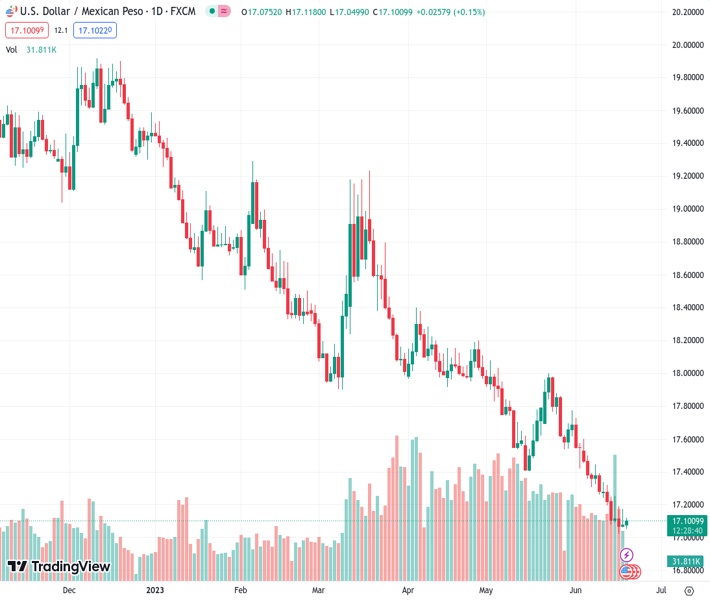 USDMXN currently trading at 17.0883 at the time of writing. Pair opened at 17.0804 and is trading with a change of 0.05 % .