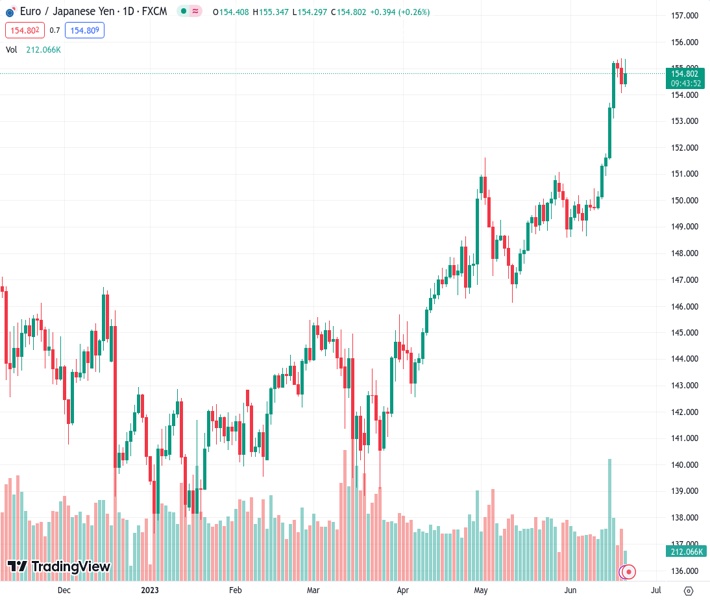 EURJPY currently trading at 154.84 at the time of writing. Pair opened at 154.44 and is trading with a change of 0.26 % .