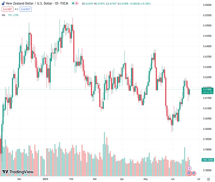 The NZDUSD currency pair reaches a high of approximately 0.6200, then settles at around 0.6160 before bouncing back up to 0.6190.