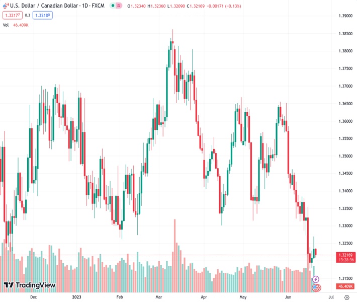 The USDCAD currency pair at a rate of 1.32158 is experiencing a decrease after a brief recovery from its lowest point in nine months, and has reached a new low for the day.