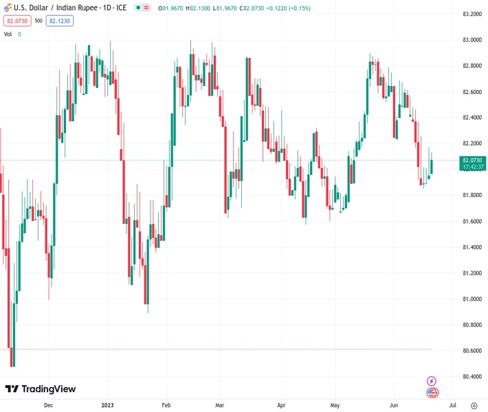 USDINR currently trading at 82.1003 at the time of writing. Pair opened at 81.9924 and is trading with a change of 0.13% % .
