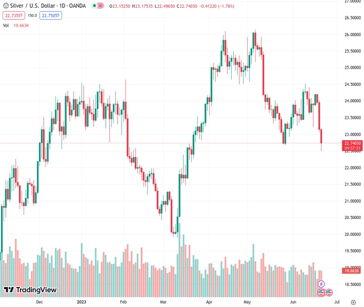 XAGUSD currently trading at 22.73 at the time of writing. Pair opened at 23.18 and is trading with a change of -1.94 % .