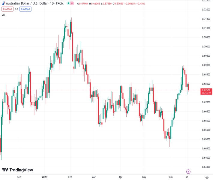 AUDUSD currently trading at 0.6759 at the time of writing. Pair opened at 0.6797 and is trading with a change of -0.56 % .