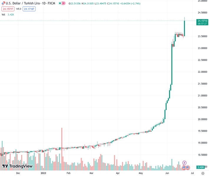After two consecutive daily declines, the USD/TRY currency pair has rebounded and continued its upward trend past the 23.6000 level. This occurred despite investor disappointment following the Turkish central bank’s decision to raise the One-Week Repo Rate by 650 basis points during its event on Thursday.