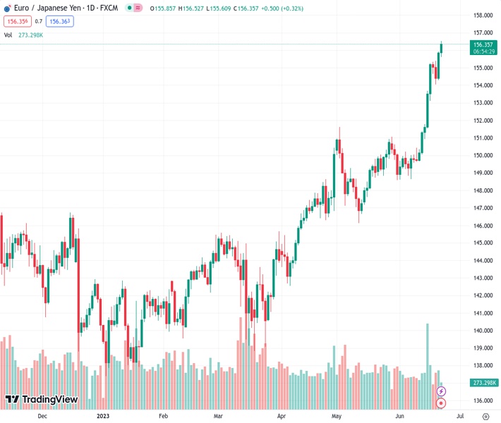 EURJPY currently trading at 156.1 at the time of writing. Pair opened at 155.9 and is trading with a change of 0.13 % .