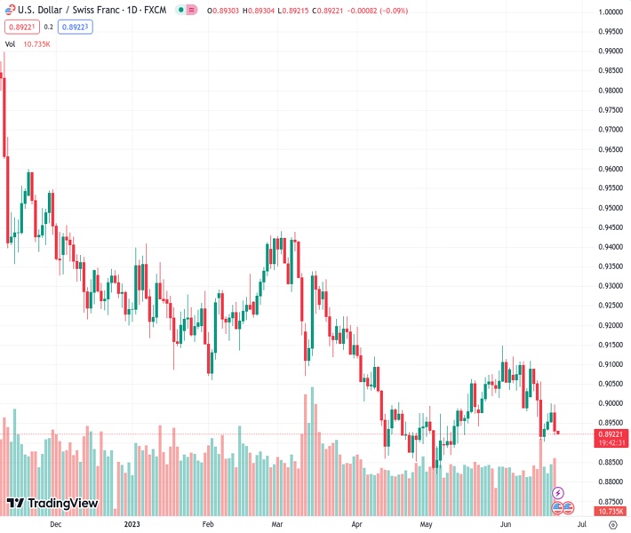 USDCHF currently trading at 0.8925 at the time of writing. Pair opened at 0.8931 and is trading with a change of -0.07% % .