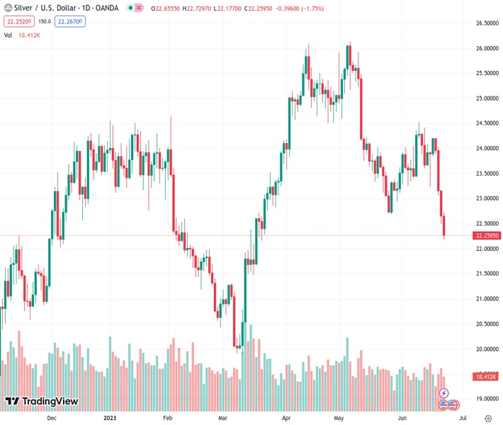 Silver price plunges past the May 26 daily low support at $22.68, extending its losses towards the $22.20 area with sellers eyeing the $21.00 handle. Therefore, XAG/USD Is trading at $22.23, down by 1.80% after hitting a daily high of $22.72, slightly below the 200-day Exponential Moving Average (EMA)