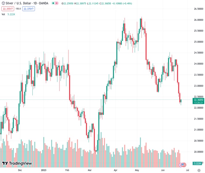 Silver stages a modest bounce from the vicinity of the $22.00 round-figure mark, or over a three-month low touched this Friday and for now, seems to have snapped a four-day losing streak. Spot prices, however, lack follow-through buying and trade below the mid-$22.00s, around the 61.8% Fibonacci retracement level of the March-May rally heading into the European session.