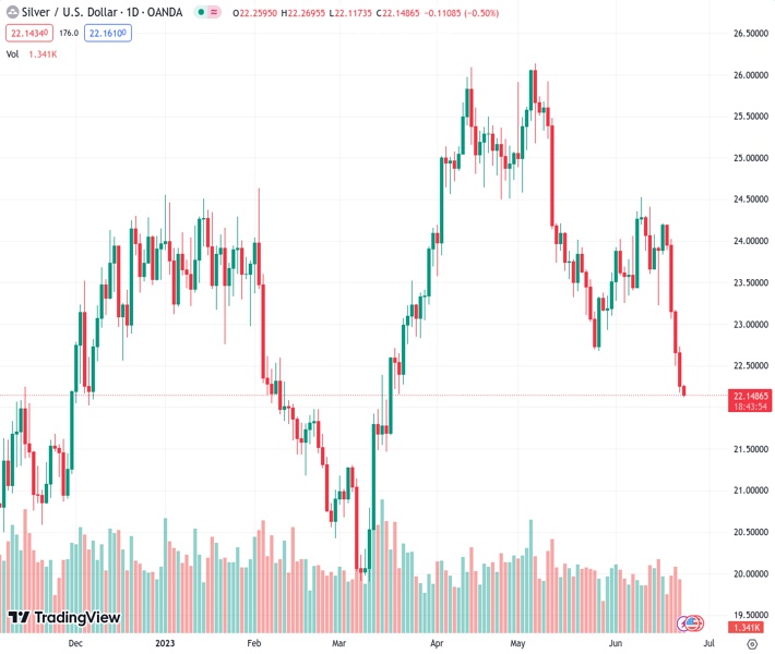 Silver Price (XAG/USD) stands on slippery grounds as it declines for the fifth consecutive day to print the lowest level since March 17 to around $22.15 amid Friday’s Asian session.