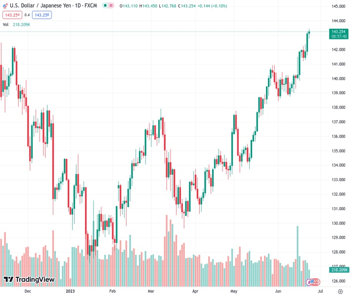 USDJPY currently trading at 143.24 at the time of writing. Pair opened at 143.12 and is trading with a change of 0.08 % .