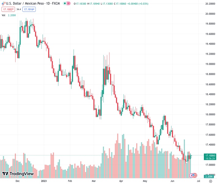 USDMXN currently trading at 17.1826 at the time of writing. Pair opened at 17.1832 and is trading with a change of -0.00% % .