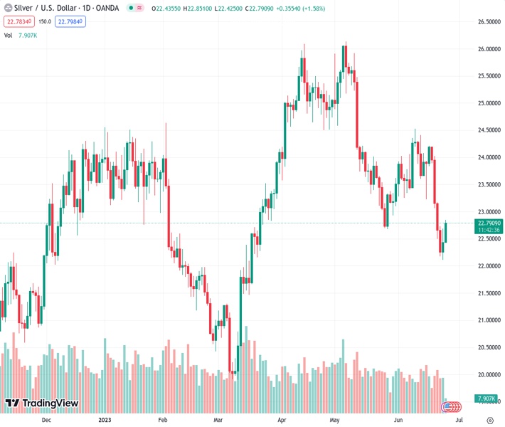 XAGUSD currently trading at 22.79 at the time of writing. Pair opened at 22.44 and is trading with a change of 1.56 % .