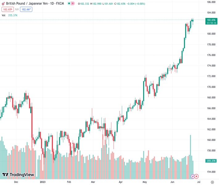 The GBPJPY has experienced an increase in value near the 182.55 range, currently trading at 182.654.
